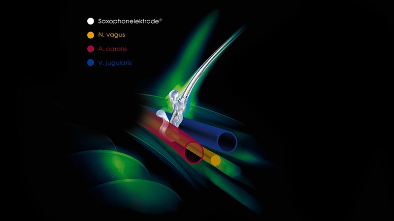 The new Saxophone Electrode ® surrounds the nerve and adapts its shape to the anatomical structures. Thanks to the flexible, open design and the integrated electrodes, there is no risk of pinching the nerve. However, the Saxophone Electrode ® surrounds the vagus nerve sufficiently to ensure reliable stimulation and stable nerve signals.
